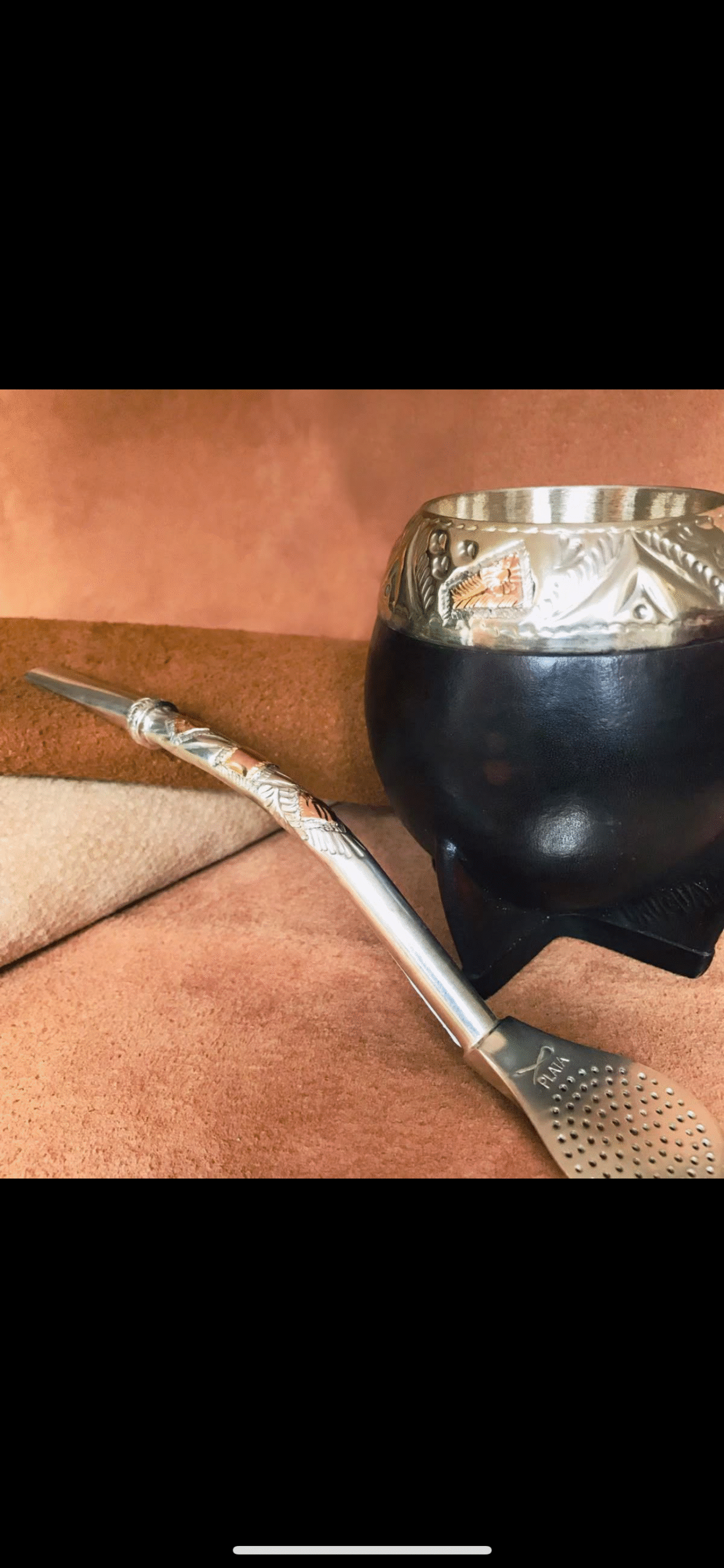 “Mate forrado en cuero, con boca de plata cincelada y tres apliques de oro. Incluye placa para personalizar con iniciales. Se presenta en conjunto con una bombilla de plata con tres apliques de oro, logrando una combinación elegante y armoniosa.”